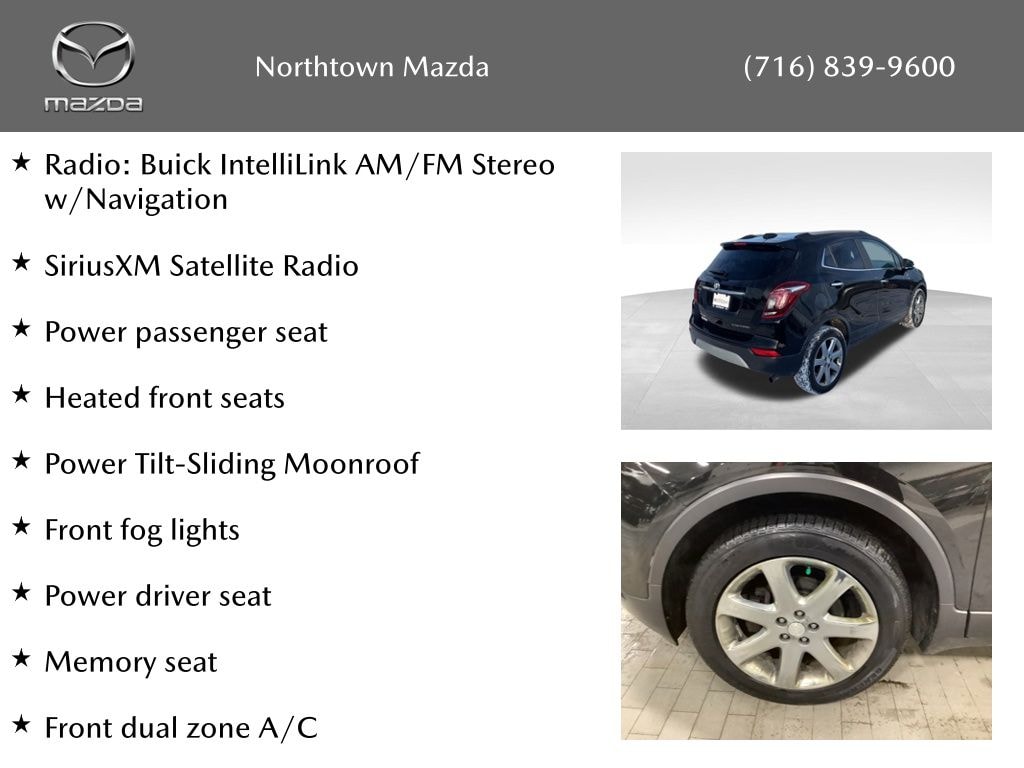 See the rest of our inventory at: NORTHTOWN MAZDA.COM Experience Buick Package (18" 7-Spoke Chromed Aluminum Wheels, Power Tilt-Sliding Moonroof, Radio: Buick IntelliLink AM/FM Stereo w/Navigation, and SiriusXM Satellite Radio), Preferred Equipment Group 1SL (6-Speaker Audio System), Alloy wheels, Apple CarPlay/Android Auto, Electronic Stability Control, Front dual zone A/C, Front fog lights, Heated door mirrors, Heated front seats, Heated steering wheel, Knee airbag, Memory seat, Power driver seat, Power passenger seat, 18" Aluminum Wheels, 3.53 Final Drive Axle Ratio, 4-Wheel Disc Brakes, 6 Speakers, 6-Way Power Driver Seat Adjuster, 6-Way Power Front Passenger Seat Adjuster, ABS brakes, Air Conditioning, AM/FM radio: SiriusXM, Auto-dimming Rear-View mirror, Automatic temperature control, Black Carbon Metallic Lower Exterior Accent Color, Brake assist, Bumpers: body-color, Compass, Delay-off headlights, Driver door bin, Driver vanity mirror, Driver's Seat Mounted Armrest, Dual front impact airbags, Dual front side impact airbags, Emergency communication system: OnStar Guidance, Exterior Parking Camera Rear, Front anti-roll bar, Front Bucket Seats, Front License Plate Bracket, Front reading lights, Front wheel independent suspension, Fully automatic headlights, Garage door transmitter, Heated Driver & Front Passenger Seats, Illuminated entry, Leather-Appointed Seat Trim, Low tire pressure warning, Occupant sensing airbag, Outside temperature display, Overhead airbag, Panic alarm, Passenger door bin, Passenger vanity mirror, Power door mirrors, Power steering, Power windows, Premium audio system: IntelliLink, Radio data system, Radio: Buick IntelliLink AM/FM Stereo, Rear seat center armrest, Rear side impact airbag, Rear window defroster, Rear window wiper, Remote keyless entry, Ride & Handling Suspension, Roof rack: rails only, Security system, Speed control, Speed-sensing steering, Split folding rear seat, Spoiler, Steering wheel mounted audio controls, Tachometer, Telescoping steering wheel, Tilt steering wheel, Traction control, Trip computer, Turn signal indicator mirrors, and Variably intermittent wipers.